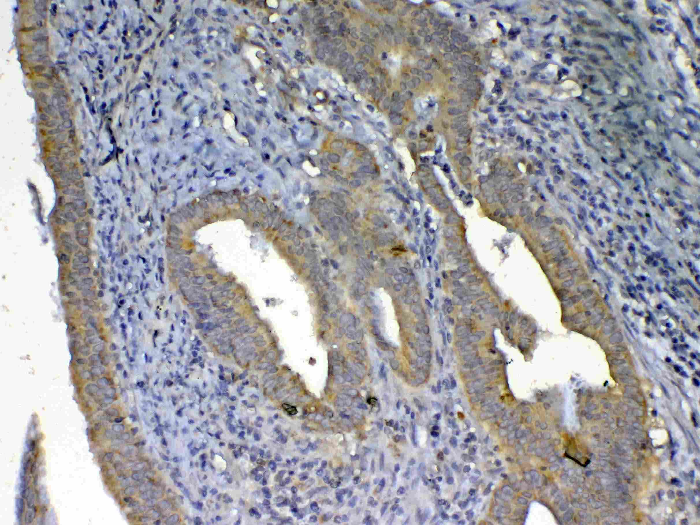 Immunohistochemistry: Paraffin-embedded Human rectal cancer tissue. Antigen Retrieval: Heat mediated was performed in Citrate buffer (pH 6.0, epitope retrieval solution) for 20 min. The tissue section was blocked with 10% goat serum. The tissue section was then stained with ARG59306 anti-UGT1A1 antibody at 1 ug/ml, overnight at 4°C.