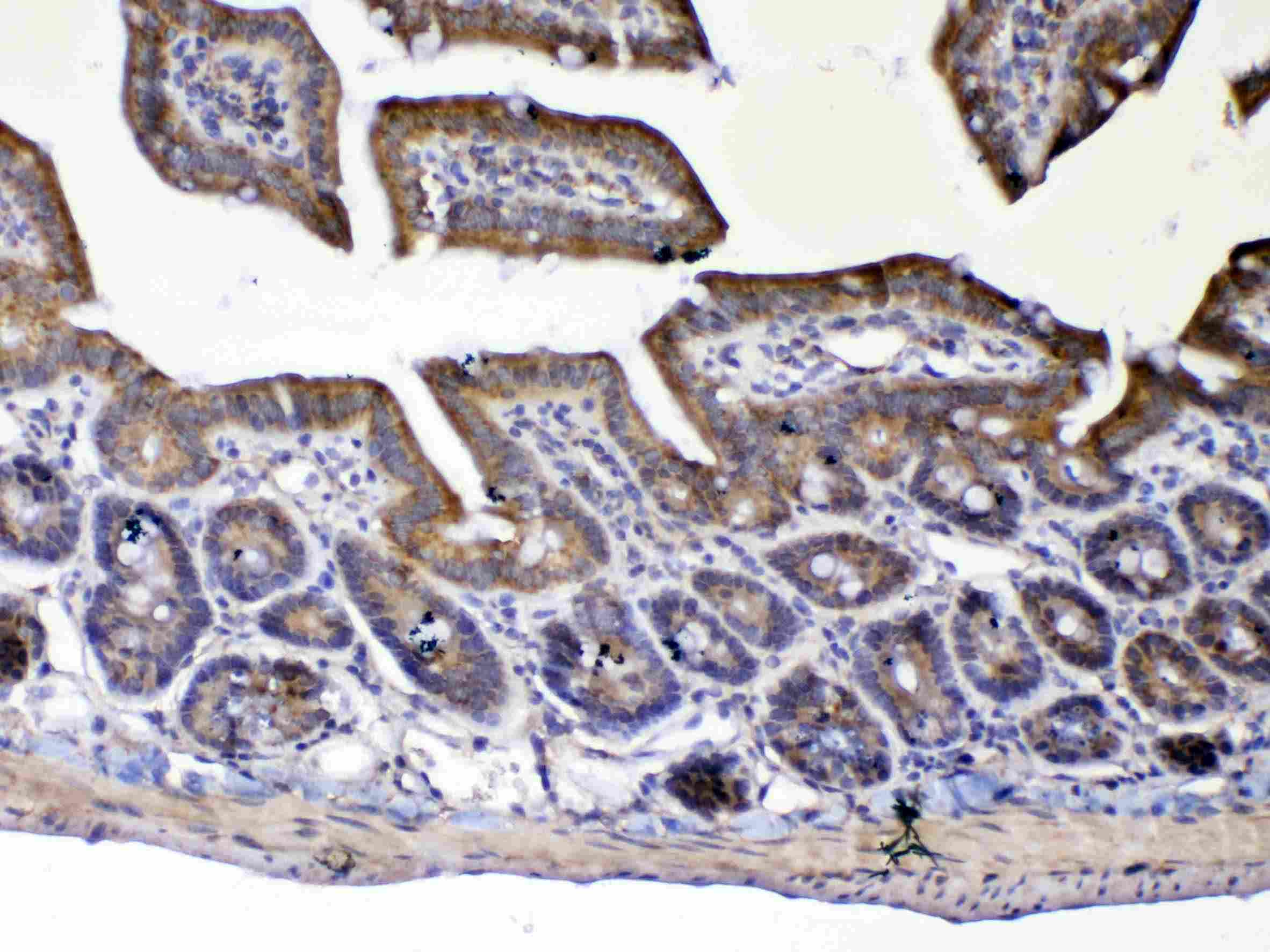 Immunohistochemistry: Paraffin-embedded Mouse small intestine tissue. Antigen Retrieval: Heat mediated was performed in Citrate buffer (pH 6.0, epitope retrieval solution) for 20 min. The tissue section was blocked with 10% goat serum. The tissue section was then stained with ARG59306 anti-UGT1A1 antibody at 1 ug/ml, overnight at 4°C.