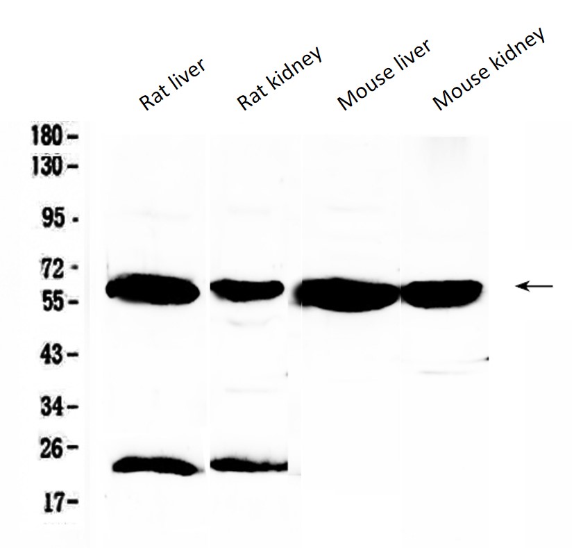 Western blot: 50 ug of samples under reducing conditions. Rat liver, Rat kidney, Mouse liver and Mouse kidney lysates stained with ARG59306 anti-UGT1A1 antibody at 0.5 ug/ml, overnight at 4°C.