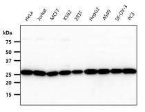 Western blot: 40 µg of HeLa, Jurkat, MCF7, K562, 293T, HepG2, A549, SK-OV-3 and PC3 cell lysates stained with ARG56937 anti-UNG antibody [k1C12] at 1:1000 dilution.
