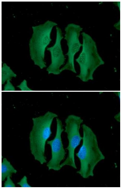 Immunofluorescence: HeLa cells stained with ARG56937 anti-UNG antibody [k1C12] (green) at 1:100 dilution. DAPI was stained the cell nucleus (blue).