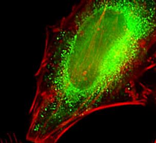 Immunofluorescence: HeLa cells stained with ARG55003 anti-USP51 antibody (green) at 1:25 dilution. Cytoplasmic actin was counterstained with Alexa Fluor® 555 conjugated with Phalloidin (red).