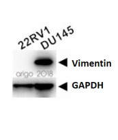 Western blot: 20 µg of 22RV1 and DU145 cell lysates stained with ARG66302 anti-Vimentin antibody [SQab1859] at 1:2000 dilution and ARG65680 anti-GAPDH antibody at 1:10000 dilution.