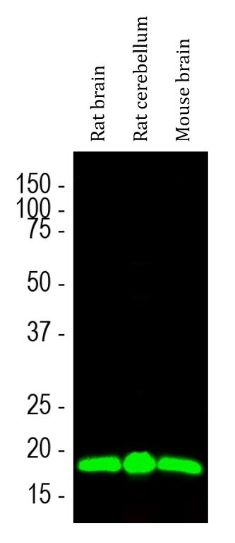 Western blot: Rat brain, Rat cerebellum and Mouse brain lysates stained with ARG52470 anti-Visinin like 1 antibody [2D11] (green) at 1:1000 dilution.