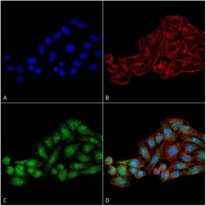 Immunofluorescence: HeLa cells fixed with 4% Formaldehyde for 15 min at RT. Cells were stained with ARG23721 anti-WDR45 antibody at 1:100 for 60 min at RT. Magnification: 60X. (A) DAPI. (B) Phalloidin Texas Red F-Actin stain. (C) Primary antibodies. (D) Composite.