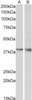 Western blot: Mouse Kidney (A) and Brain (B) lysate (35 µg protein in RIPA buffer) stained with ARG65016 anti-Wnt15 / Wnt9b antibody at 1 µg/ml dilution.