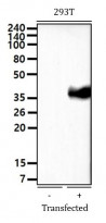 Western blot: 293T cells untransfected (left) or transfected by Wnt3a (right). 40 µg of cell lysates stained with ARG56971 anti-Wnt3a antibody [3A6] at 1:1000 dilution.