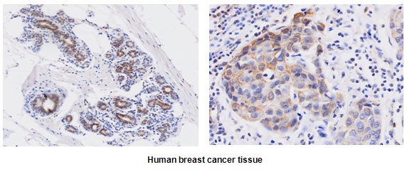 Immunohistochemistry: Paraffin embedded sections of Human breast cancer tissue stained with ARG56971 anti-Wnt3a antibody [3A6] at 1:50 for 2 hours at RT. Antigen Retrieval: Boil tissue section in 0.1M Sodium citrate buffer (pH 6.0) for 20 min.
