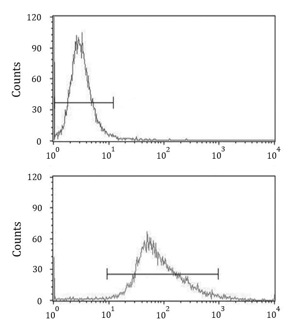 Flow Cytometry: MDA-MB468 cells stained with ARG55444 anti-Wnt4 antibody (bottom histogram) or without primary antibody control (top histogram), followed by incubation with FITC labelled secondary antibody.