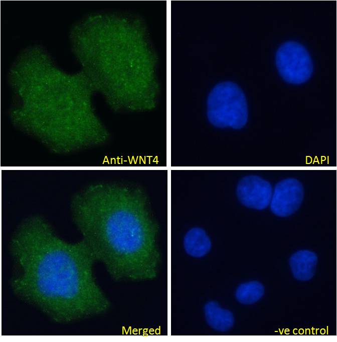 Immunofluorescence: Paraformaldehyde fixed HeLa cells permeabilized with 0.15% Triton. Cells were stained with ARG63522 anti-Wnt4 antibody (green) at 10 µg/ml dilution for 1 hour. DAPI (blue) for nuclear staining. Negative control: Unimmunized goat IgG (green) at 10 µg/ml dilution.