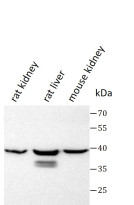 Western blot: Rat kidney, Rat liver ,Mouse kidney stained with ARG41733 anti-Wnt7a antibody at 1:1000 dilution.