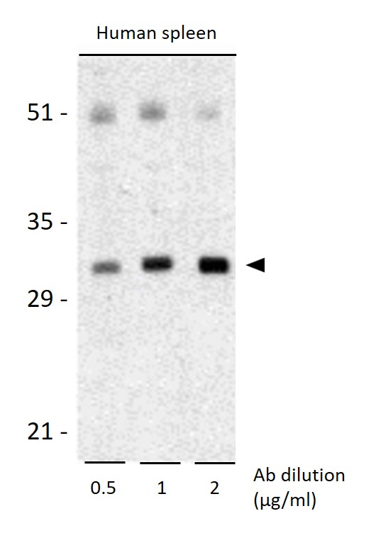 Western blot: Human spleen lysate stained with ARG59427 anti-XAF1 antibody at 0.5, 1 and 2 µg/ml dilutions.