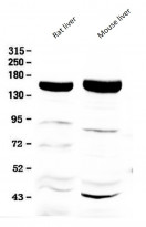Western blot: 50 µg of samples under reducing conditions. Rat liver and Mouse liver tissue lysates stained with ARG59194 anti-XDH / Xanthine Oxidase antibody at 0.5 µg/ml, overnight at 4°C.
