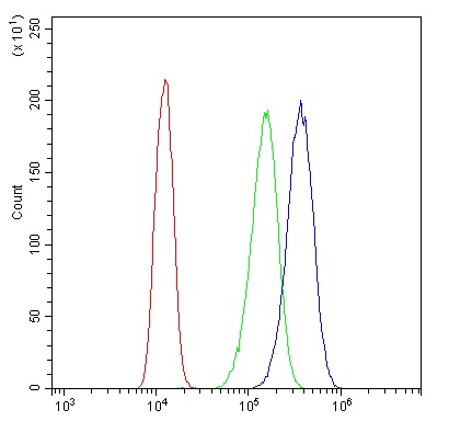 Flow Cytometry: A431 cells were blocked with 10% normal goat serum and then stained with ARG59194 anti-XDH / Xanthine Oxidase antibody (blue) at 1 µg/10^6 cells for 30 min at 20°C, followed by incubation with DyLight®488 labelled secondary antibody. Isotype control antibody (green) was rabbit IgG (1 µg/10^6 cells) used under the same conditions. Unlabelled sample (red) was also used as a control.