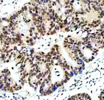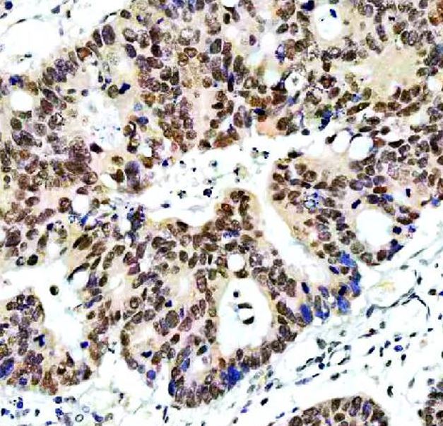 Immunohistochemistry: Human colon cancer stained with ARG45882 anti-XPG antibody at 2 μg/ml dilution.