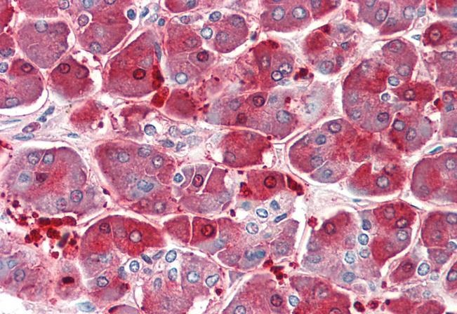 Immunohistochemistry: Paraffin-embedded Human pancreas tissue. Antigen Retrieval: Steam tissue section in Citrate buffer (pH 6.0). The tissue section was stained with ARG64953 anti-XPNPEP1 antibody at 5 µg/ml dilution followed by AP-staining.