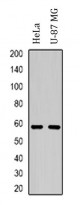 Western blot: HeLa and U-87 MG whole cell lysates stained with ARG66624 anti-YARS / TyrRS antibody.