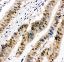 Immunohistochemistry: Human intestinal cancer stained with ARG45146 anti-ZBTB7A antibody at 1 μg/ml dilution.