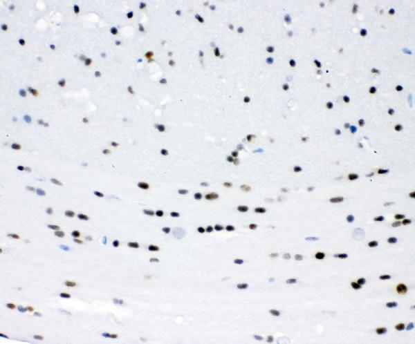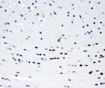 Immunohistochemistry: Paraffin-embedded Rat brain tissue. Antigen Retrieval: Heat mediation was performed in Citrate buffer (pH 6.0) for 20 min. The tissue section was blocked with 10% goat serum. The tissue section was then stained with ARG58745 anti-ZEB2 antibody at 1 µg/ml dilution, overnight at 4°C.