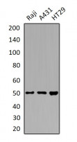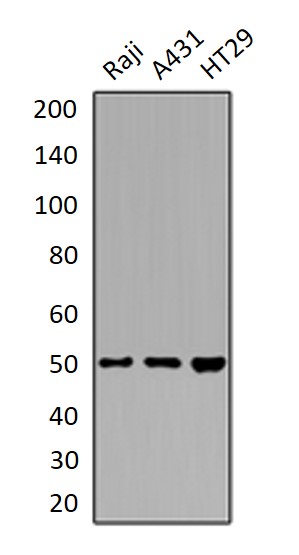Western blot: Raji, A431 and HT29 whole cell lysates stained with ARG65803 anti-ZFYVE19 / ANCHR antibody.