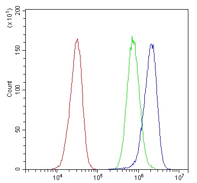 Flow Cytometry: HepG2 cells were blocked with 10% normal goat serum and then stained with ARG59342 anti-alpha A Crystallin antibody (blue) at 1 µg/10^6 cells for 30 min at 20°C, followed by incubation with DyLight®488 labelled secondary antibody. Isotype control antibody (green) was rabbit IgG (1 µg/10^6 cells) used under the same conditions. Unlabelled sample (red) was also used as a control.