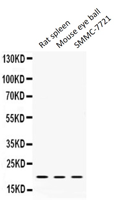 Western blot: Rat spleen, Mouse eye ball and SMMC-7721 whole cell lysates stained with ARG59342 anti-alpha A Crystallin antibody at 0.5 µg/ml dilution.