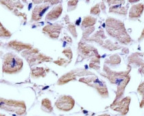 Immunohistochemistry: Paraformaldehyde-fixed and paraffin-embedded Human heart tissue stained with ARG56410 anti-alpha Tubulin 6 antibody at 1:25 dilution, 1 hour at 37°C. Tissue was blocked with 3% BSA for 0.5 hour at RT. Antigen Retrieval: Heat mediation was performed in Citrate buffer (pH 6.0).