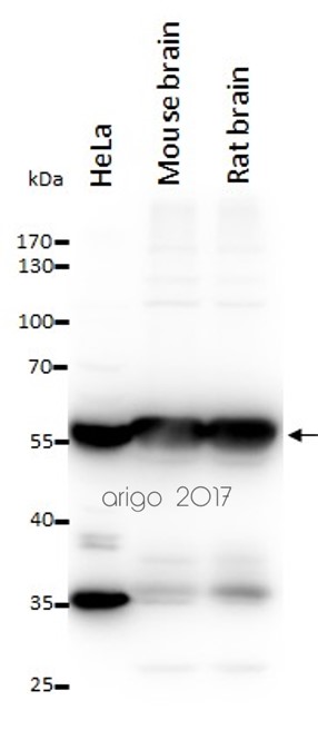 Western blot: 20 µl of HeLa cell lysate and 10 µl of Mouse / Rat brain lysates stained with ARG56410 anti-alpha Tubulin 6 antibody at 1:1000 dilution.