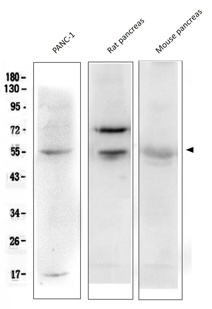 Western blot: 50 µg of samples under reducing conditions. PANC-1, Rat pancreas and Mouse pancreas lysates stained with ARG59664 anti-alpha amylase antibody at 0.5 µg/ml, overnight at 4°C.