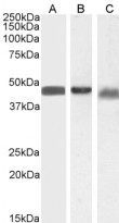 Western blot: 35 µg of Human spleen (A), Mouse brain (B) and Mouse spleen (C) lysates (in RIPA buffer) stained with ARG63749 anti-beta Arrestin 2 antibody at 0.1 µg/ml (A) and 1 µg/ml (B, C) dilutions and incubated at RT for 1 hour.