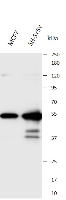 Western blot: MCF7 and SH-SY5Y stained with ARG44762 anti-beta III Tubulin antibody at 1 µg/mL dilution.