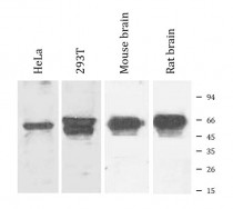 Western blot: HeLa, 293T, Mouse brain and Rat brain lysates stained with ARG66891 anti-c-Fos antibody at 1:2000 dilution.
