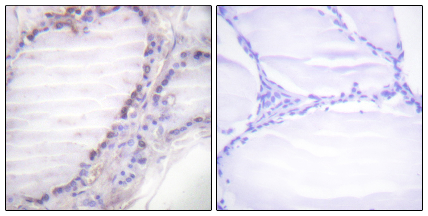 Immunohistochemistry: Paraffin-embedded Human thyroid gland tissue stained with ARG66706 anti-c-Fos phospho (Ser362) antibody. The picture on the right was blocked with the phospho peptide.