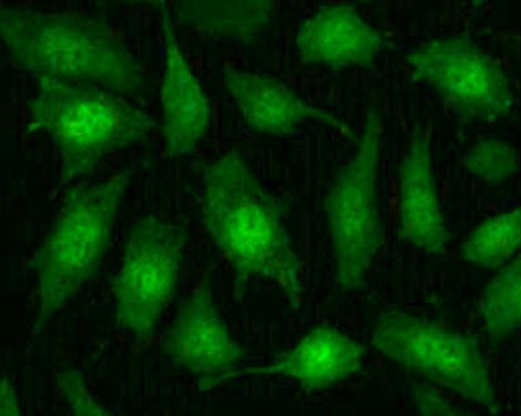 Immunofluorescence: L929 cells stained with ARG42122 anti-eEF1E1 / AIMP3 antibody at 1:100 dilution.