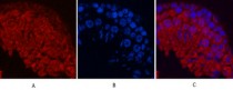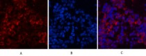Picture A: Target. Picture B: DAPI. Picture C: merge of A+B.