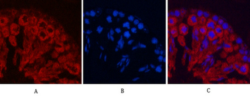 Immunohistochemistry: Mouse testis tissue stained with ARG66176 anti-eIF4A1 antibody (red) at 1:200 dilution (4°C, overnight).