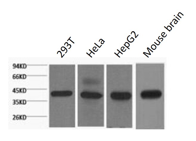 Western blot: 1) 293T, 2) HeLa, 3) HepG2, and 4) Mouse brain tissue lysates stained with ARG66176 anti-eIF4A1 antibody.