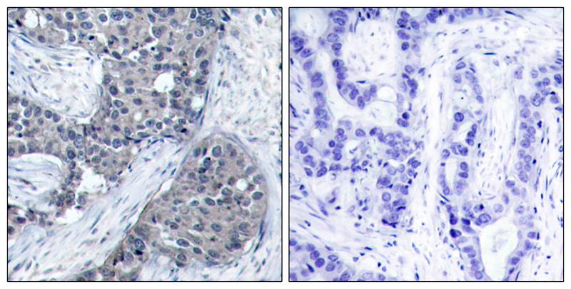 Immunohistochemistry: Paraffin-embedded Human breast carcinoma tissue stained with ARG51723 anti-eIF4E phospho (Ser209) antibody (left) or the same antibody preincubated with blocking peptide (right).