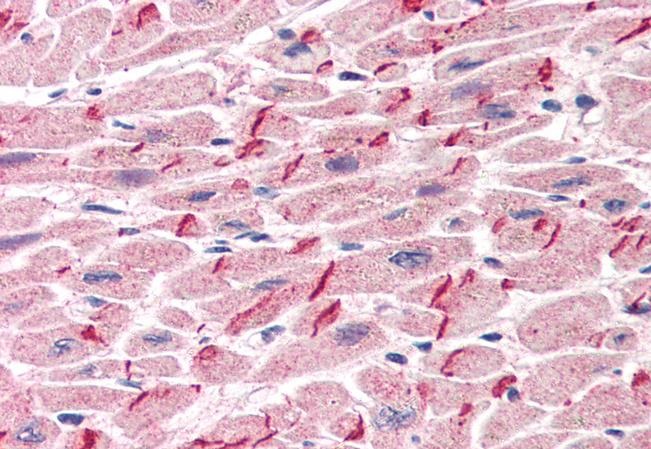 Immunohistochemistry: Paraffin-embedded Human heart tissue. Antigen Retrieval: Steam tissue section in Citrate buffer (pH 6.0). The tissue section was stained with ARG63457 anti-gamma Catenin antibody at 5 µg/ml dilution followed by AP-staining.