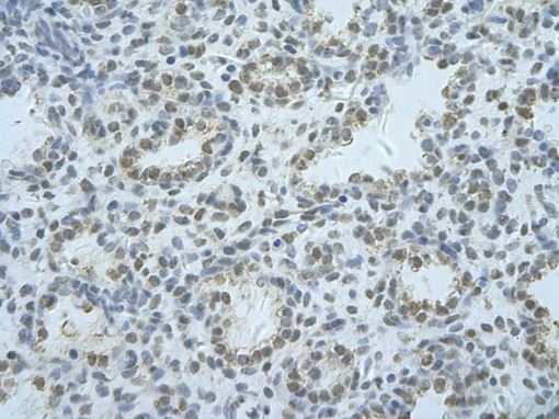 Immunohistochemistry: Paraffin-embedded Human kidney (Epithelial cells of renal tubule) stained with ARG58939 anti-hnRNP F antibody at 4 - 8 µg/ml dilution.
