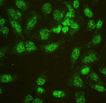 Immunofluorescence: U2OS cells were blocked with 10% goat serum and then stained with ARG58799 anti-hnRNP L antibody (green) at 2 µg/ml dilution, overnight at 4°C.
