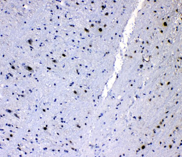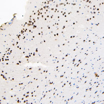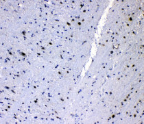 Immunohistochemistry: Paraffin-embedded Mouse brain tissue. Antigen Retrieval: Heat mediation was performed in Citrate buffer (pH 6.0) for 20 min. The tissue section was blocked with 10% goat serum. The tissue section was then stained with ARG58799 anti-hnRNP L antibody at 1 µg/ml dilution, overnight at 4°C.