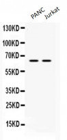 Western blot: PANC and Jurkat cell lysates stained with ARG58799 anti-hnRNP L antibody at 0.5 µg/ml dilution.