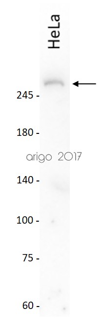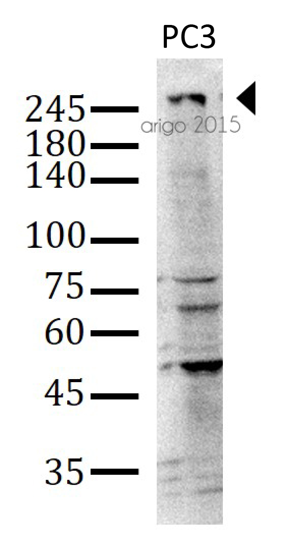 Western blot: 30 µg of PC3 cell lysate stained with ARG54727 anti-mTOR antibody at 1:1000 dilution.