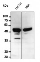 Western blot: 50 µg of HaCat and SRA lysates stained with ARG55736 anti-p53 antibody at 1:2500 dilution.