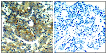 Immunohistochemistry: Paraffin-embedded Human breast carcinoma tissue stained with ARG51753 anti-p70 S6 Kinase phospho (Ser411) antibody (left) or the same antibody preincubated with blocking peptide (right).