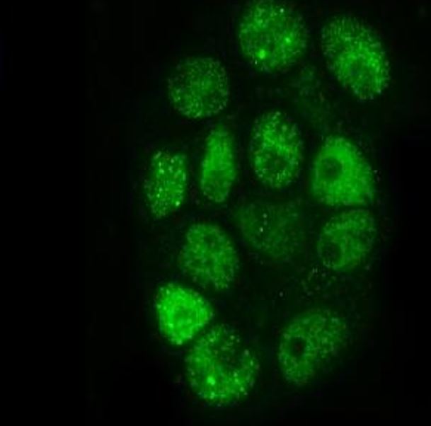 Immunofluorescence: A431 stained with ARG45466 anti-p95 / NBS1 antibody [5D7A1] at 5 μg/ml dilution.