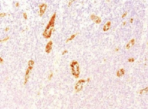Immunohistochemistry: Formalin-fixed and paraffin-embedded Human tonsil tissue. Antigen Retrieval: Boil tissue section in 10 mM Tris with 1 mM EDTA (pH 9.0) for 10-20 min, followed by cooling at RT for 20 min. The tissue section was stained with ARG42214 anti-vWF antibody [3E2D10].