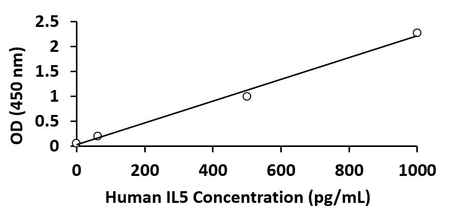 ARG83800 arigoPLEX® Human Allergy Multiplex ELISA Kit (IL4, IL5, IL13, IgE) results of a typical standard for Human IL5 run with optical density reading at 450 nm.