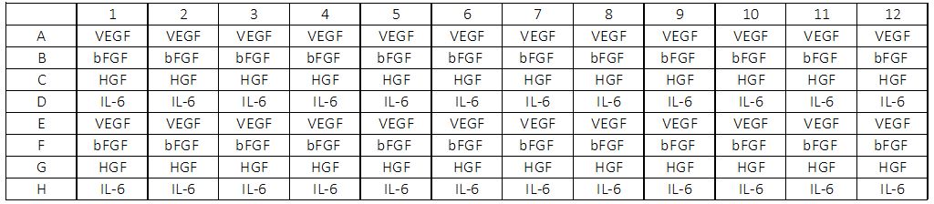 | Sensitivity | VEGF: 31.25 pg/ml FGF basic: 15.625 pg/ml HGF: 125 pg/ml IL-6: 15.625 pg/ml |
